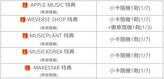 (特典皆與專輯張數1:1贈送)
