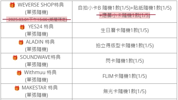 (特典皆與專輯張數1:1贈送)