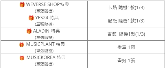 (特典皆與專輯張數1:1贈送)
