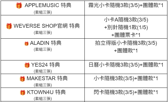 (特典皆與專輯張數1:1贈送)