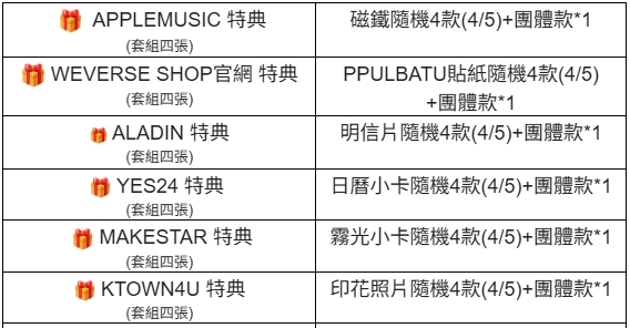 (特典皆與專輯張數1:1贈送)