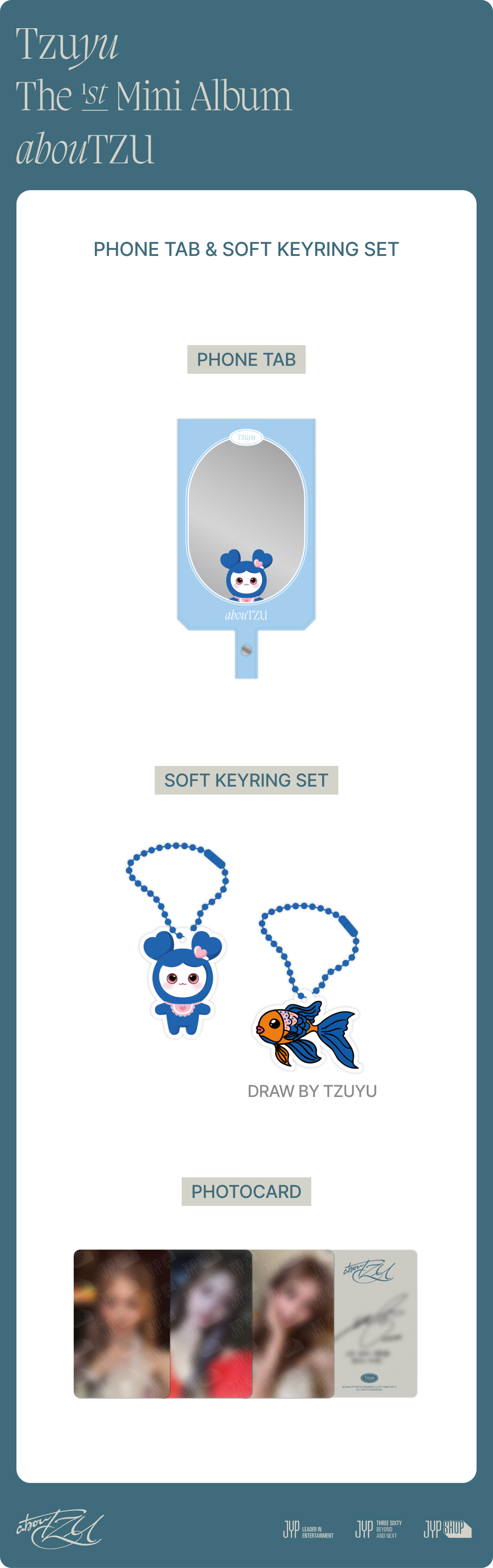 사이즈 : PHONE TAB - 6.2X11.7CM / TZUVELY CHARM - 3X4CM / HAND DRAWING CHARM - 4X3CM / PHOTOCARD - 5.5X8.5CM